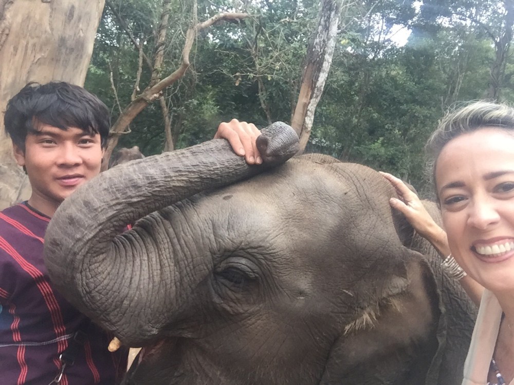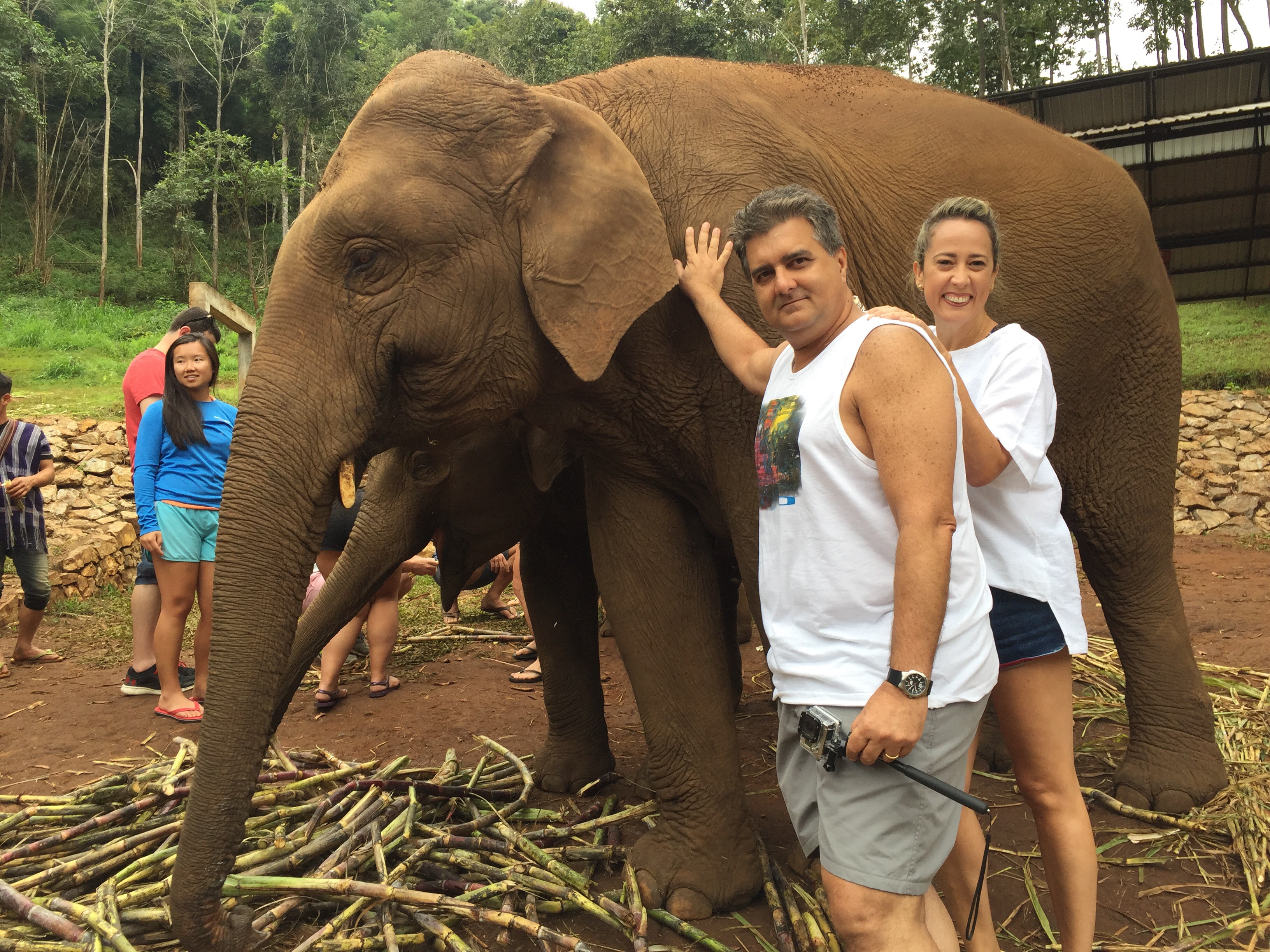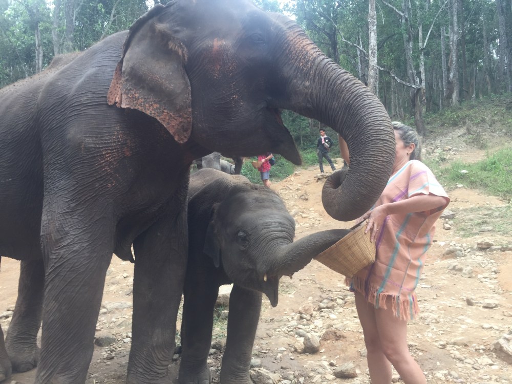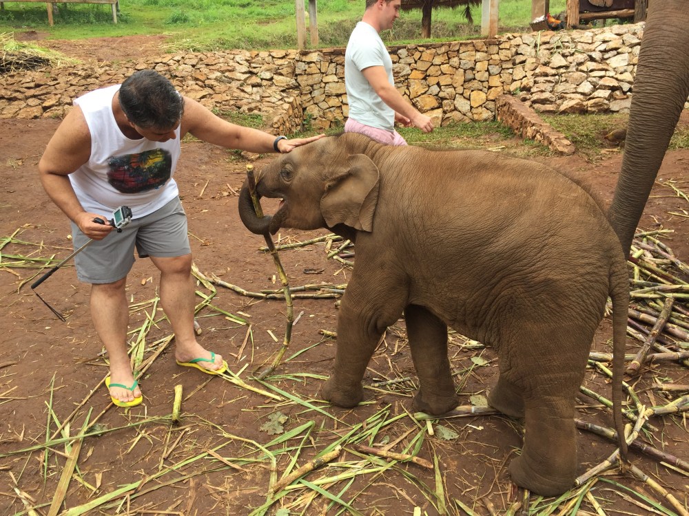 Após todo esse aprendizado sobre os elefantes, eles nos mostraram os elefantes e começaram a direcionar um pra cada pessoa, eu fiquei com uma elefanta a “Santon” e ela tinha um filhote que não desgrudava dela, a coisa mais linda. Começamos alimentando com uma cesta de frutas, tinha cana-de-açúcar, banana e uma outra que eu não conhecia. Sempre que ia dar a fruta tinha que dizer a palavra que nos ensinaram para ela abrir a boca, mas o mais engraçado é que no meu caso, eu alimentei a mãe e o filhote, que por sinal era muito guloso, minha cesta foi praticamente saqueada por ele.