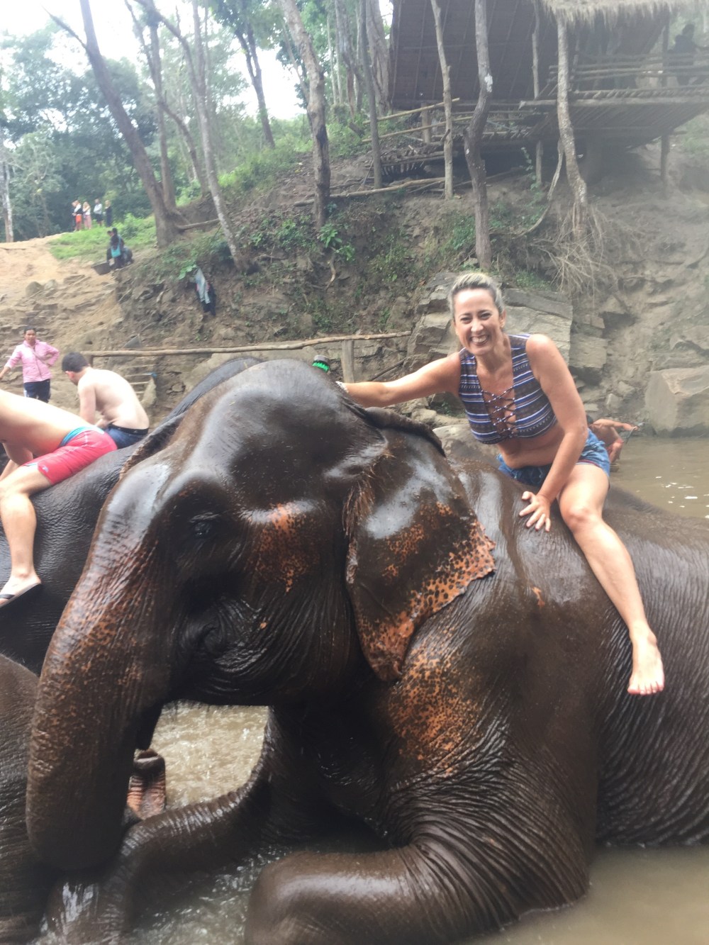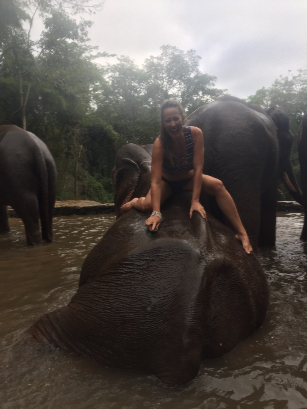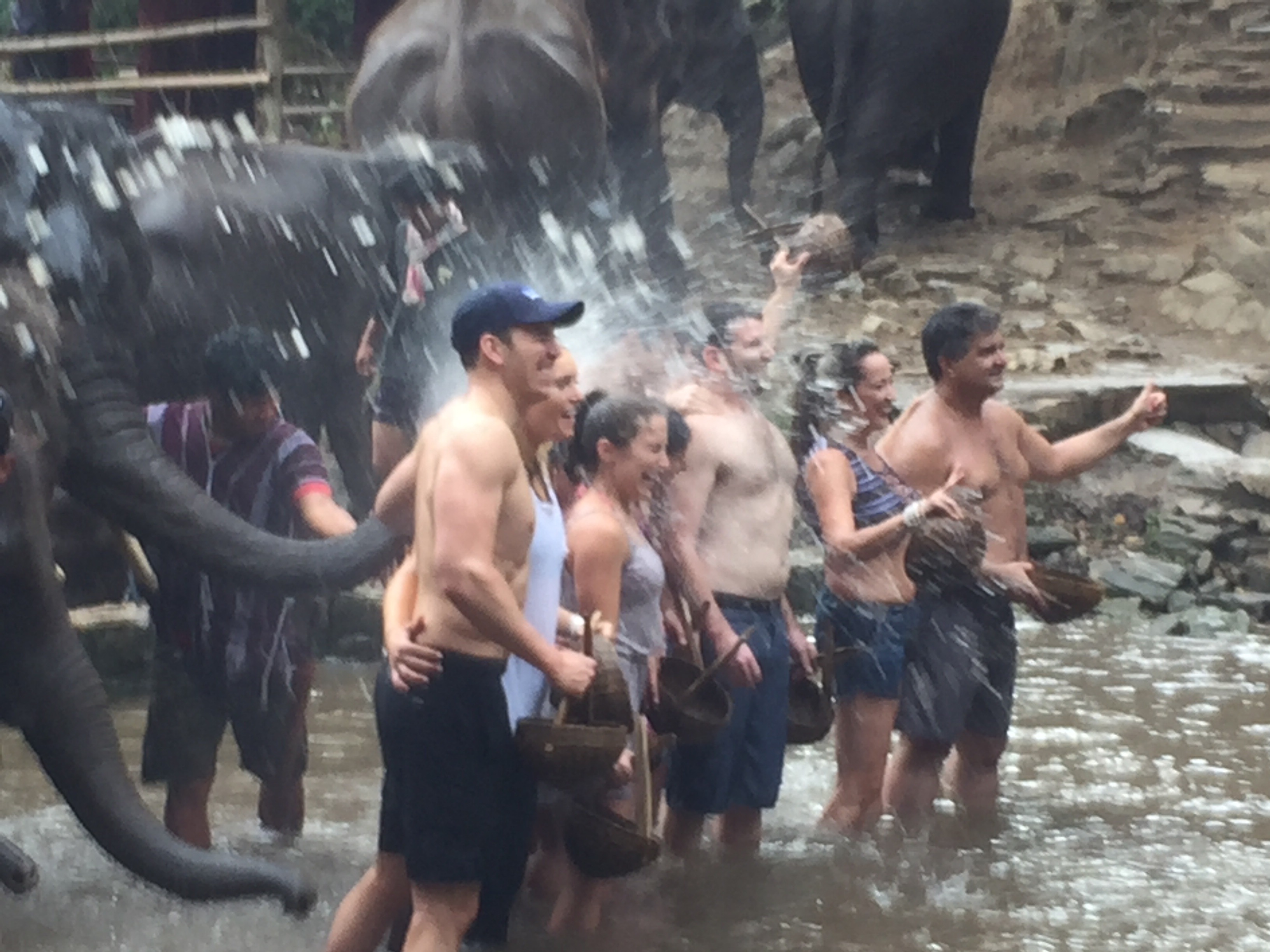 Fiquei ali por pelo menos uns 10 minutos e terminamos de dar banho neles com todos eles enfileirados no final do rio. Depois de terminado o guia mandou a gente ficar de costas para os elefantes e que eles dariam banho em nós esguichando água pela tromba.