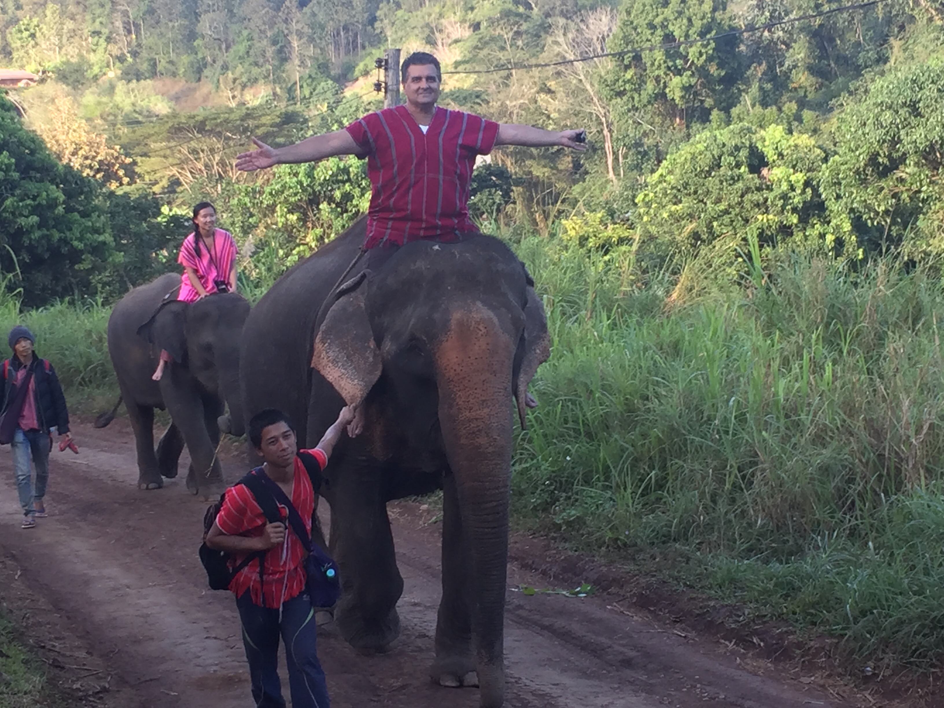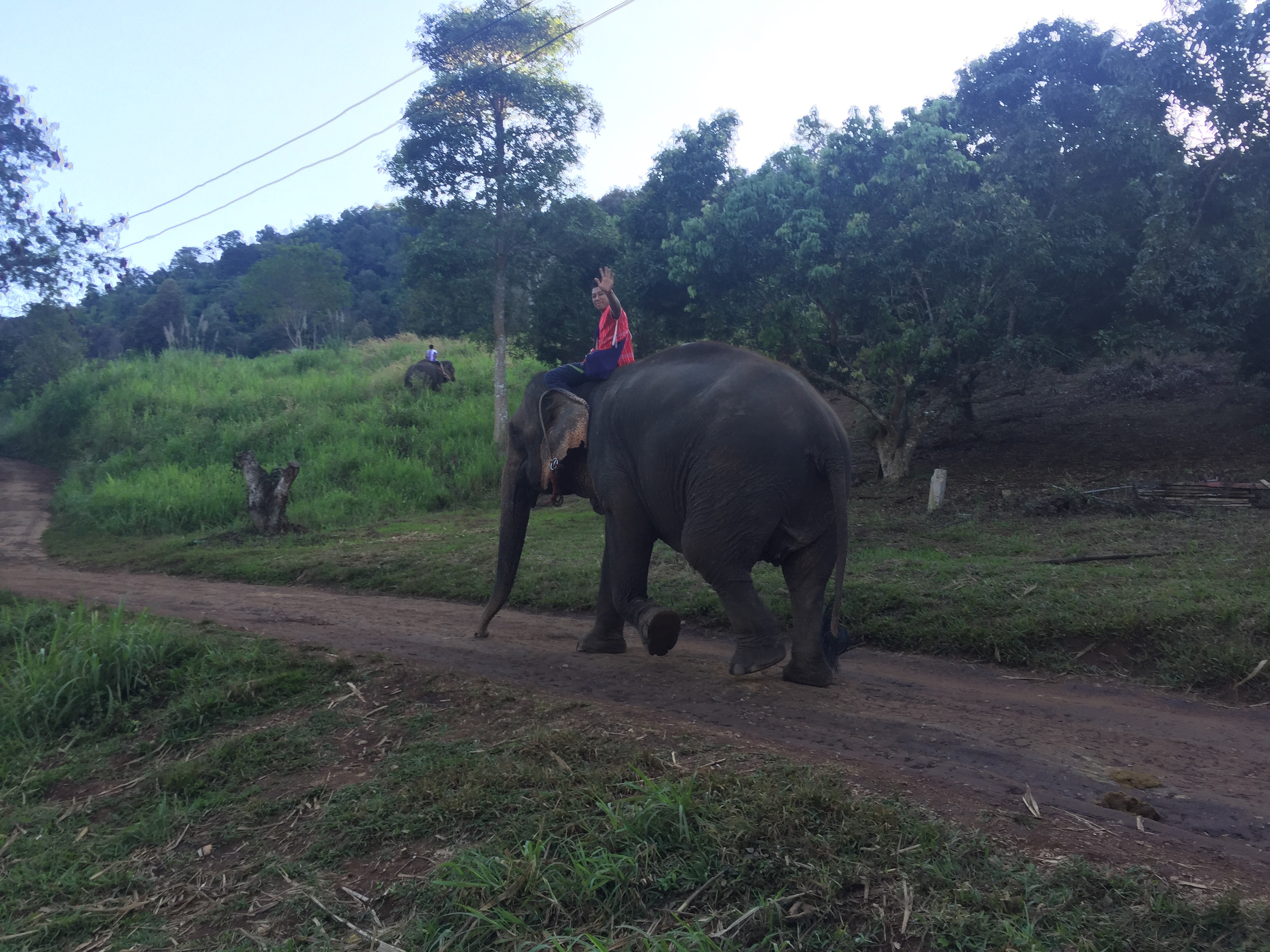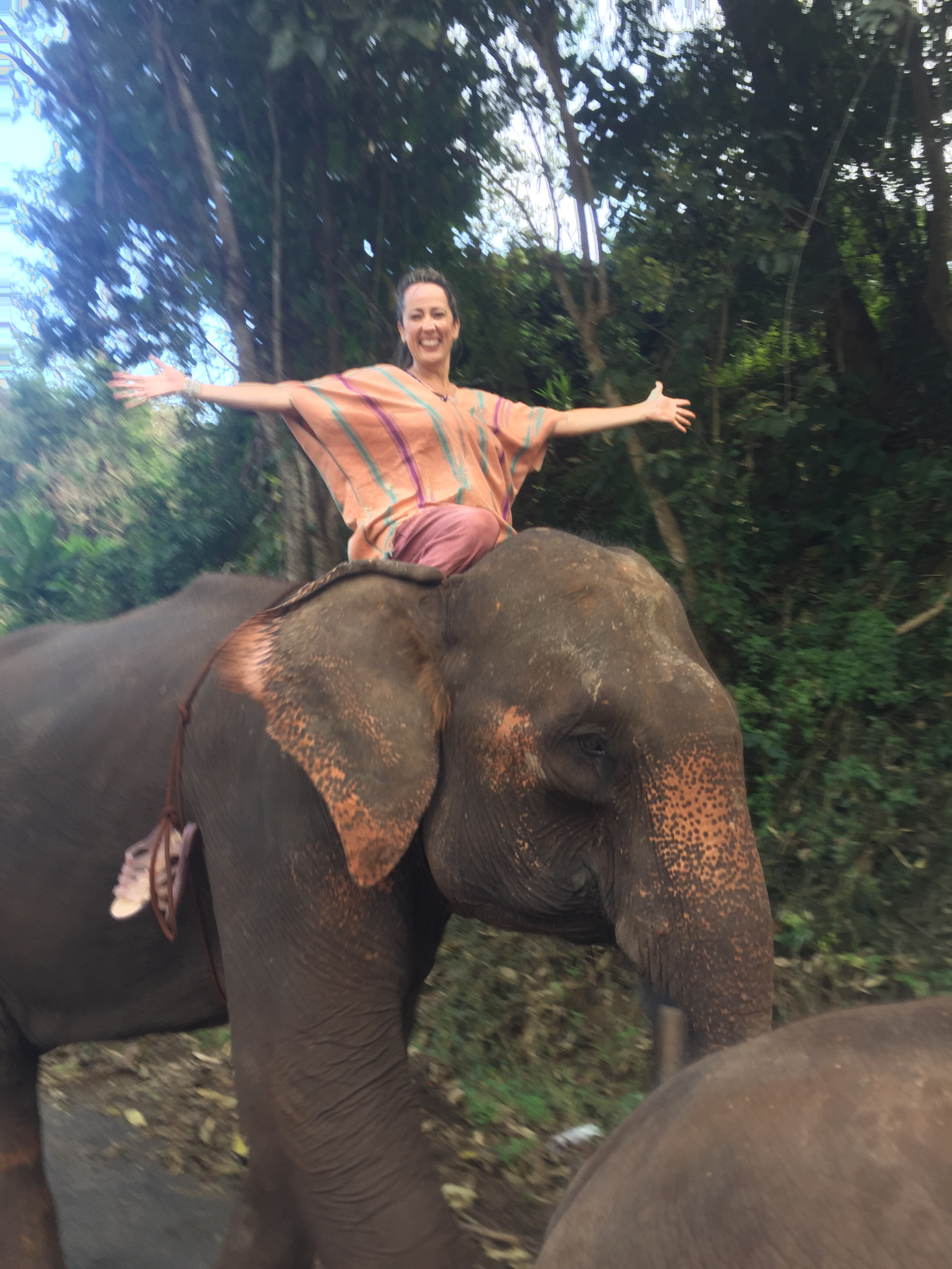 O guia pediu para sentarmos bem no pescoço dela para conseguir encaixar as pernas, já que não havia cadeira, era direto no elefante que a gente ia montado. Deu um certo medo de começo, era muito alto e não havia onde segurar, mas com o tempo peguei o jeito. Saímos do lado da fazenda em que estávamos subindo uma trilha de areia, pedras e muitos buracos, além de ser bem íngrime e fomos andando pela estrada, naquela caminhada lenta dos elefantes. Carros passavam por nós e as pessoas neles ficavam olhando com cara de espantados. Essa caminhada com o elefante foi de aproximadamente 2 km, foi demais, uma experiência única, nunca me imaginei passeando em cima de um elefante.