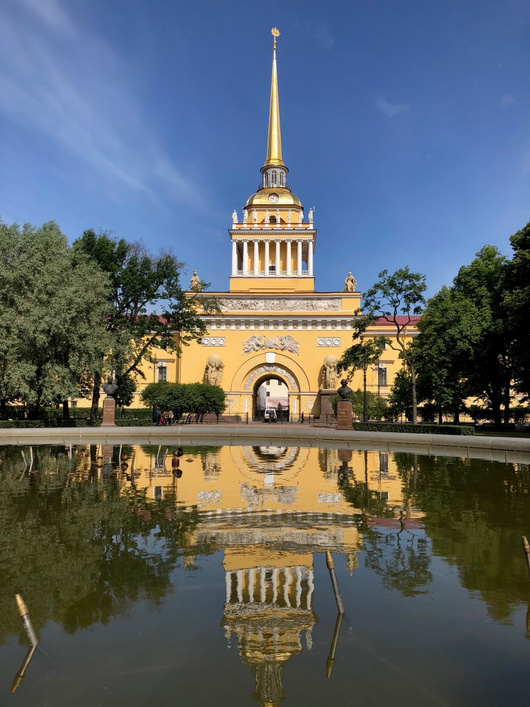Almirantado de São Petersburgo – O Almirantado de São Petersburgo, construído entre 1806 e 1823 , é a antiga sede do Conselho de Almirantes e Marinha Imperial Russa. Está localizado no extremo leste da avenida Névski , e é um dos monumentos mais conhecidos da cidade. O edifício foi construído para simbolizar as ambições marítimas do czar. O projeto original consistia num estaleiro fortificado que foi mais tarde cercado por cinco baluartes e cuja proteção foi reforçada com um fosso. O Almirantado, com o seu pináculo dourado encimado por um cata-vento com a forma de um pequeno navio de guerra (Korablik), é um dos marcos de maior destaque da cidade e o ponto principal das três principais ruas antigas de São Petersburgo — a avenida Névski, a rua Gorokhóvaia e a avenida Voznesensky, o que sublinha a importância que Pedro I deu à Marinha Russa.