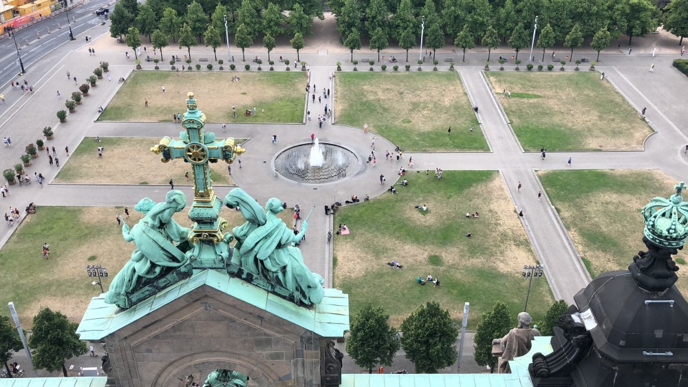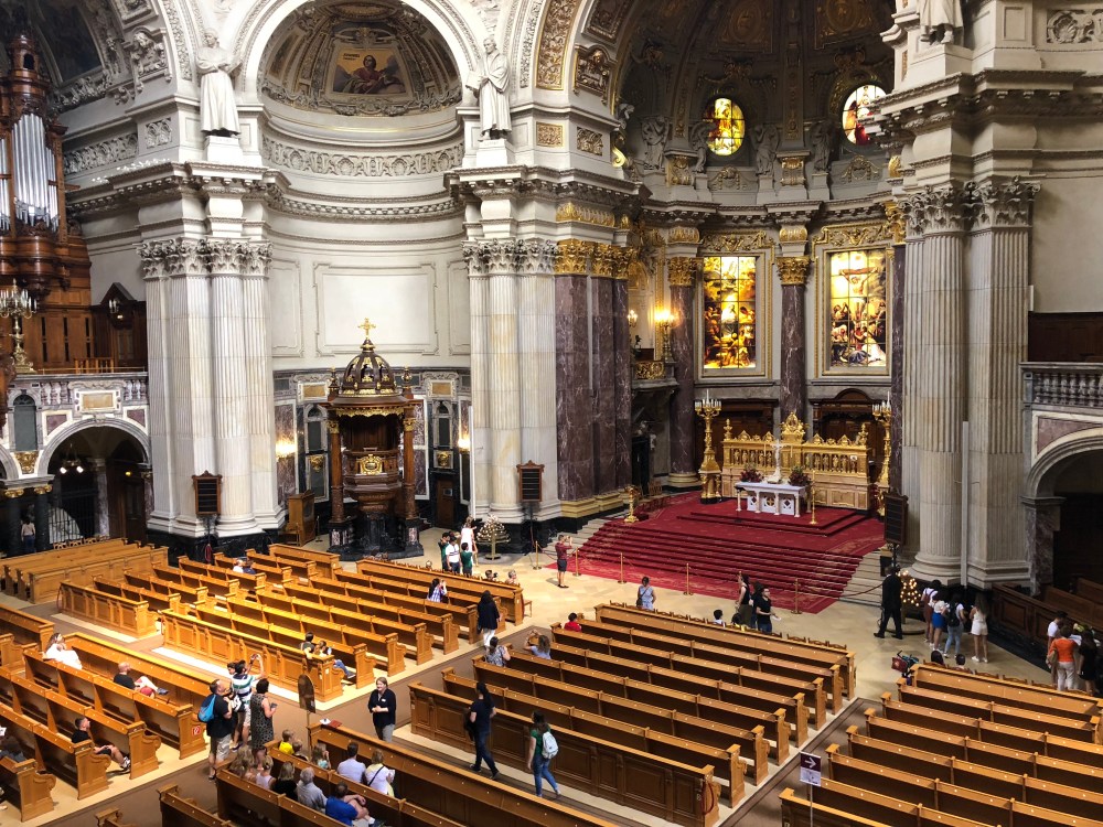 A Catedral de Berlim se encontra majestosa nas proximidades do Rio Spree, coroada por uma cúpula de cobre de cor esverdeada. Trata-se do edifício religioso mais importante de Berlim, situado em frente ao jardim Lustgarten, entre a Ilha dos Museus e o solar antes ocupado pelo Palácio Imperial. O edifício da catedral foi construído entre 1894 e 1905 sobre o alicerce de uma pequena catedral barroca de 1747, bem em frente ao Palácio Imperial. Essa proximidade com o palácio fazia da catedral a principal igreja da corte da dinastia Hohenzollern, além de ser o lugar onde eram sepultados os membros da família. Em 1944, assim como a maioria dos edifícios de Berlim, o templo foi destruído por uma bomba que caiu sobre a cúpula, causando graves danos ao interior. Embora as tarefas de reconstrução tenham começado em 1975, foram longas e caras e terminaram apenas em 2002. Dentro da catedral se destacam especialmente o recinto do altar, feito com mármore branco e ônix amarelo. Também é interessante o acesso que era usado pelo casal imperial quando ia à catedral, já que possuía uma escada própria com todo tipo de luxo, através da qual chegavam ao Camarote Imperial. Os sótãos da catedral guardam um importante tesouro: a Cripta dos Hohenzollern, conhecida por hospedar os sarcófagos dos membros da dinastia Hohenzollern. Na cripta podemos ver mais de 90 túmulos dos membros da família imperial falecidos desde o final do século XVI até o início do século XX. Através dos suntuosos sarcófagos e caixões são documentados mais de 500 anos de cultura funerária de Brandemburgo e da Prússia. O trajeto até a cúpula é feito por um caminho um pouco complicado, como se fosse chegar a um desvão abandonado, mas, depois de subir os 270 degraus que levam até o alto da cúpula da catedral, você pode curtir uma bela vista do centro de Berlim que realmente faz a subida valer a pena.