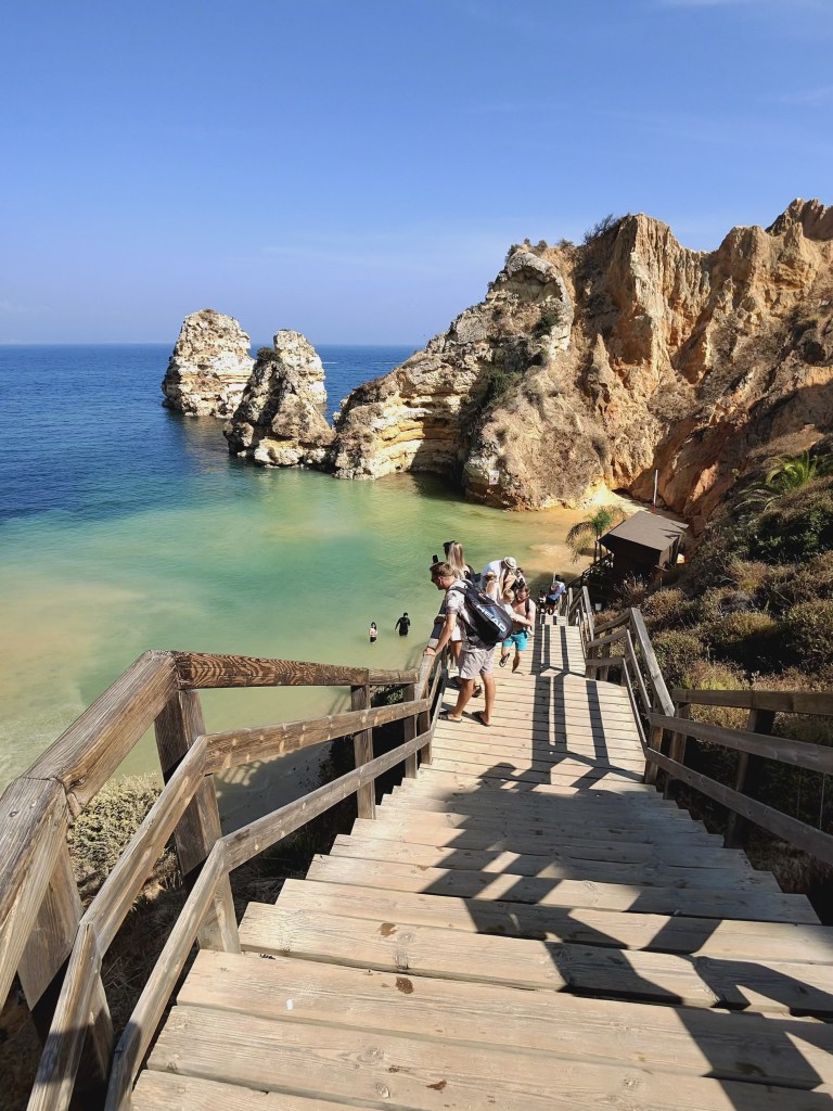 Um dos destaques da Praia é o acesso por meio de uma longa e icônica escadaria de madeira, com cerca de 200 degraus, que leva os visitantes do topo da falésia até a areia. A descida oferece vistas deslumbrantes da praia e do mar, sendo um dos locais mais fotografados de Lagos.