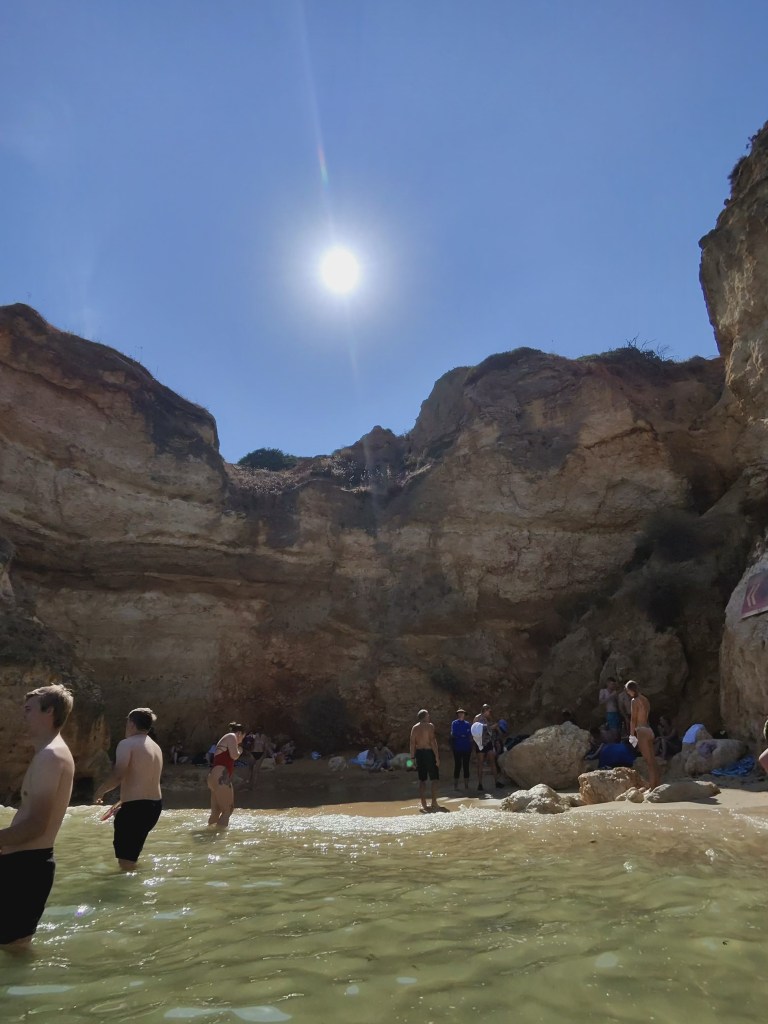 Chegando lá fomos recebidos por uma vista deslumbrante das falésias douradas que se erguem acima do mar azul profundo. O clima estava ameno, e o som das ondas quebrando contra as rochas criava uma trilha sonora relaxante.