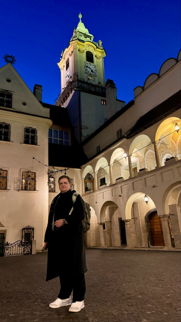 Saindo da Blue Church caminhamos até a cidade velha de Bratislava e nos deparamos com a Praça Hlavné Námestie que é a principal praça de Bratislava e está localizada no centro da Cidade Velha. Ao passar por ali, você vai avistar a bela arquitetura da cidade em prédios antigos, cafés, restaurantes, lojas de souvenirs e muitas outras belezas.