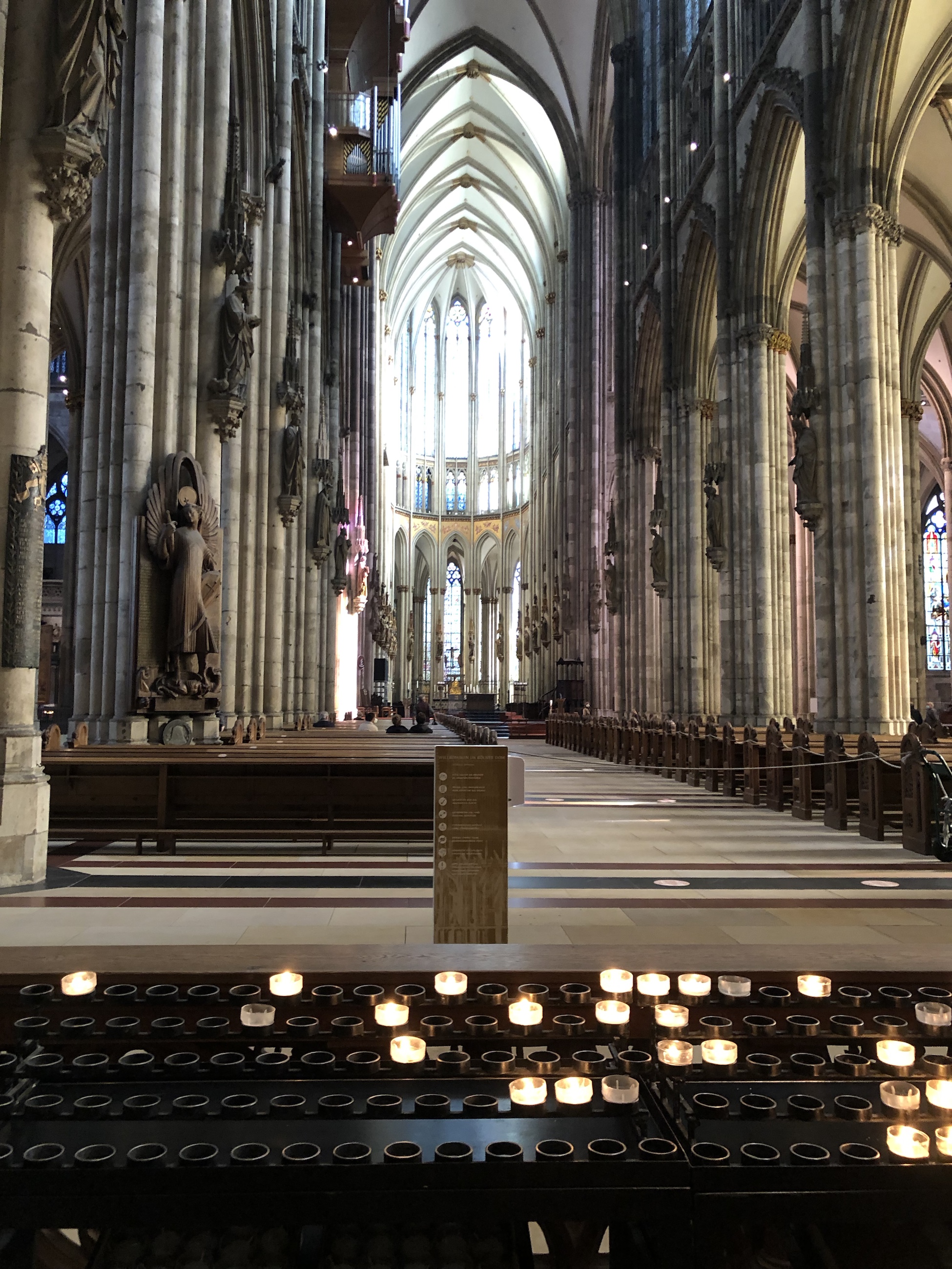 O interior da catedral, apesar de seguir a mesma linha sóbria e escura impressiona ainda mais do que sua face externa. Imensa, alta, imponente, o espaço interno é monumental. Suas colunatas, magníficas, mas não exatamente originais, dão o tom local.