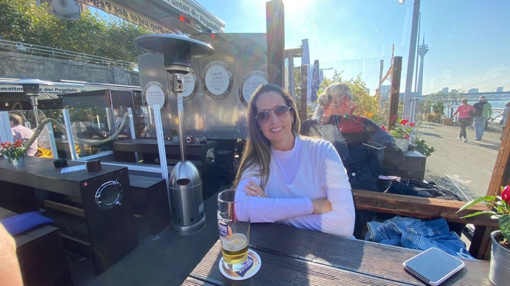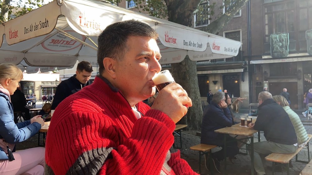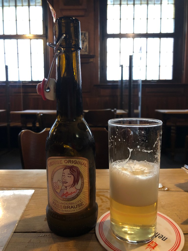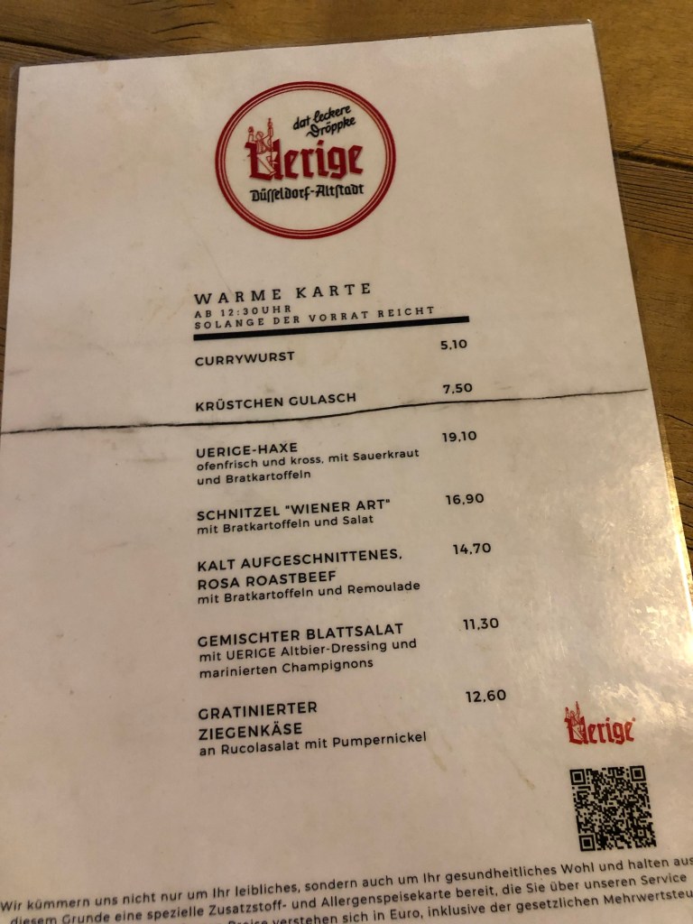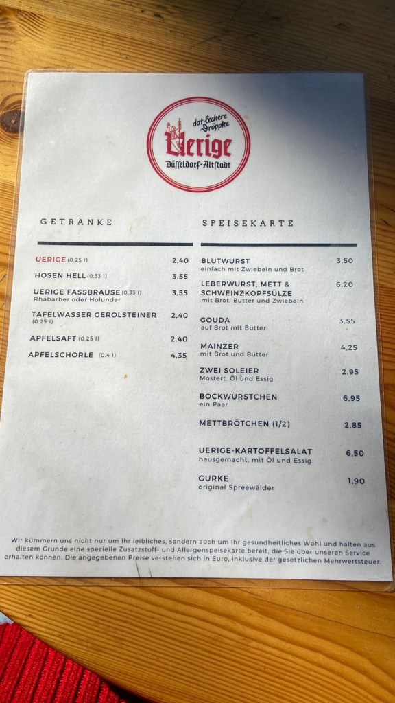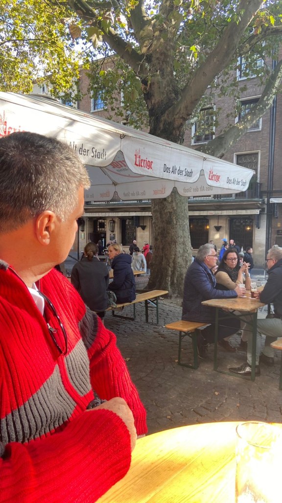 Pudemos aproveitar na cervejaria Uerige, tanto o ambiente externo, ao ar livre, onde experimentamos o chopp desta tradicional cervejaria como também o ambiente interno, na sala mais antiga da cervejaria. uma sala de canto esplendidamente patinada sendo a sala histórica em que o delicioso Droppke foi servido pela primeira vez após a Segunda Guerra Mundial em 1946.