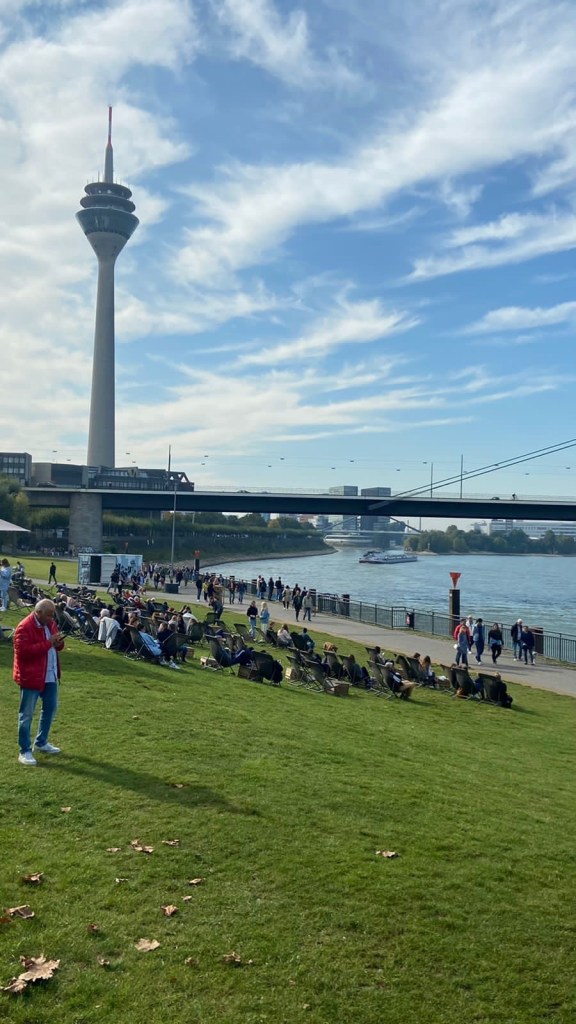 Um dos lugares que mais gostamos em Dusseldorf e que mais aproveitamos foi a Rheinuferpromenade ou Passeio do Reno que pode ser considerado um verdadeiro ponto de encontro da cidade. Por lá, turistas e moradores aproveitam o calçadão para andar de bicicleta, fazer caminhadas, participar de eventos sazonais, curtir os bares e restaurantes do lugar e até mesmo participar de um cruzeiro pelo rio. Foram muitos os navios que vimos entrando e saindo para deliciosos passeios pelo Rio Reno.