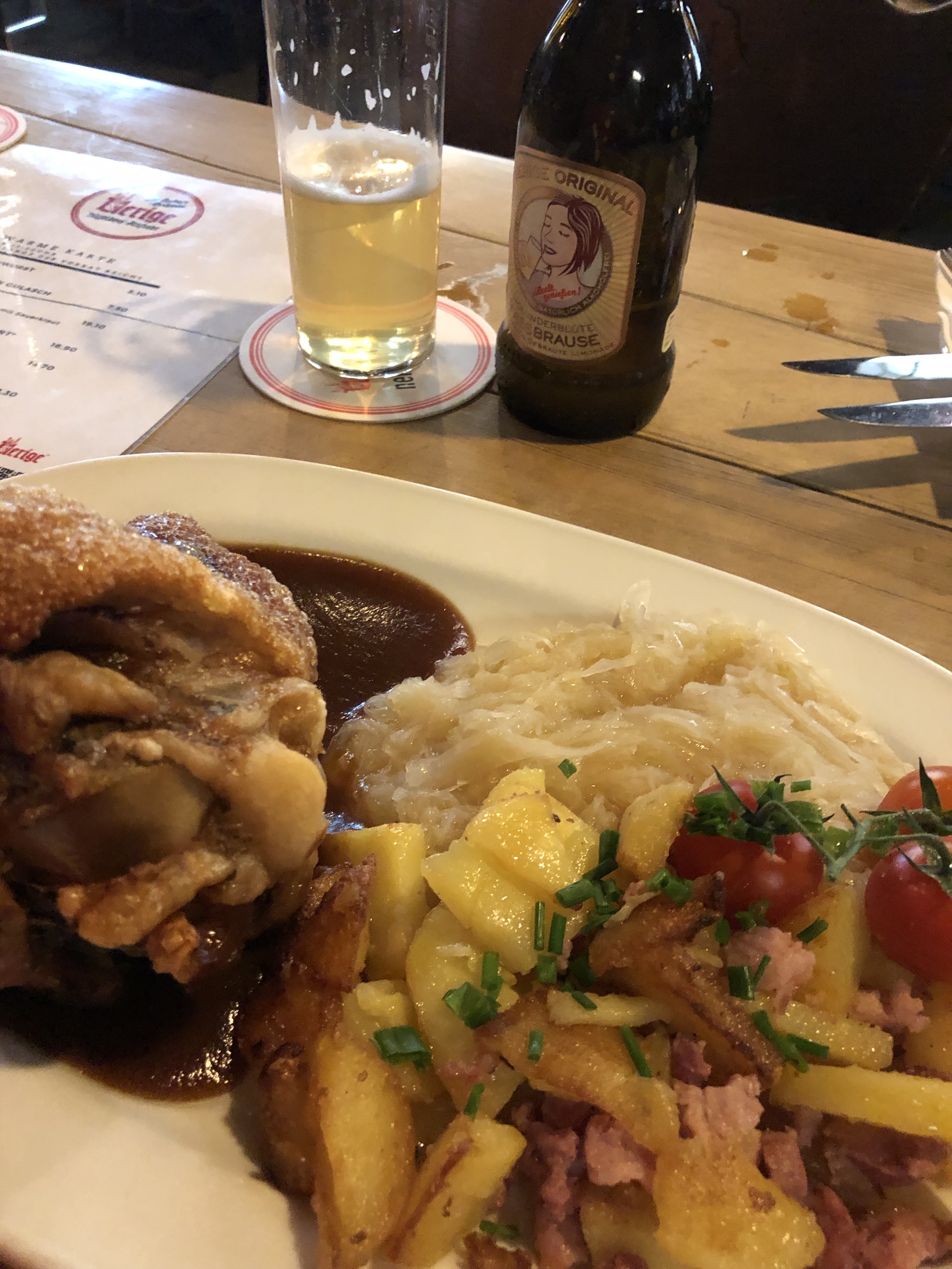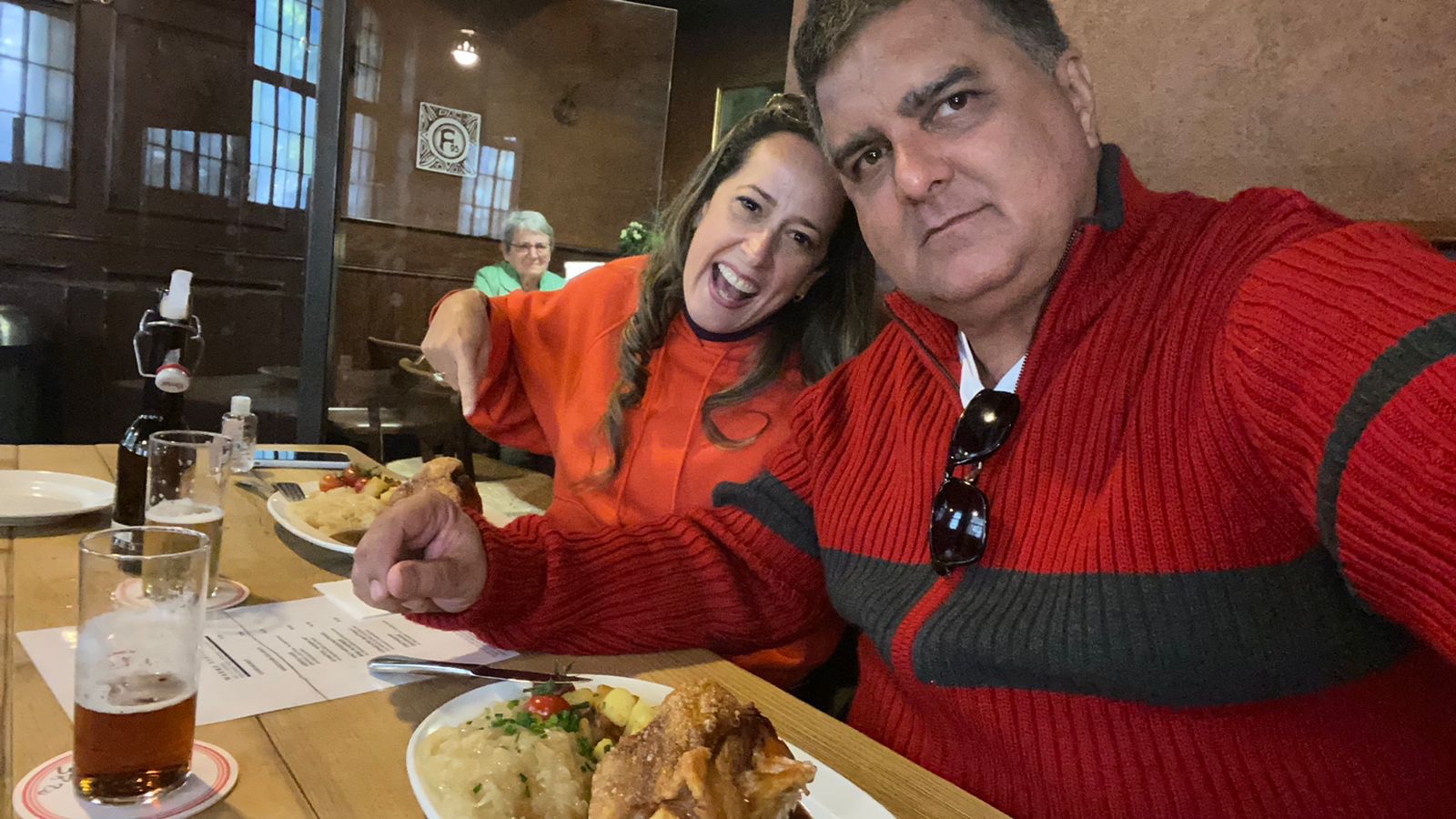 Tudo muito gostoso e surpreendente, nos deliciamos com o chopp, a cerveja sem álcool e o delicioso joelho de porco, típico da culinária Alemã.
