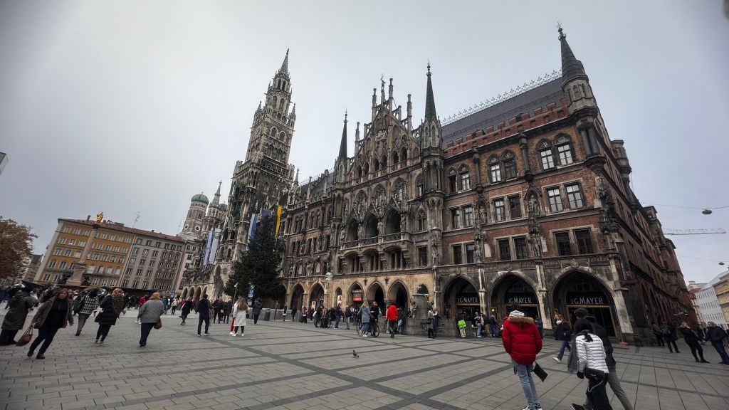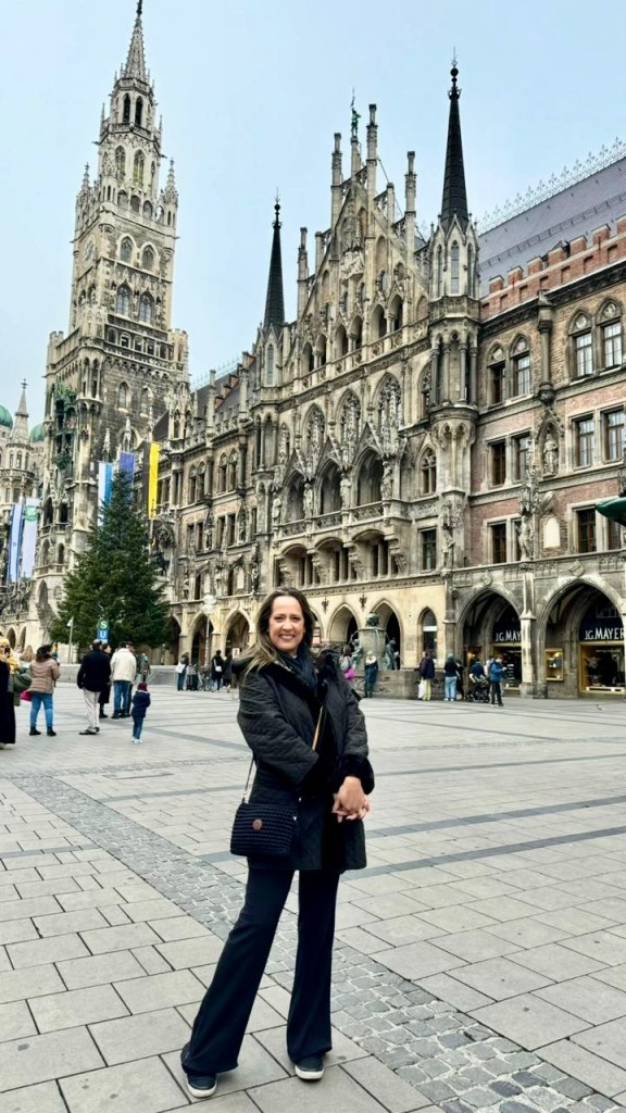 No dia seguinte, dia 12 de Novembro, nosso primeiro dia oficial em Munique, fomos direto a Marienplatz, traduzida para o português como a Praça de Maria, este ponto turístico fica bem no centro de Munique e foi fundada em 1158. No centro desta praça fica a Coluna de Maria, erguida em 1683 e que deu o nome à este local, em homenagem à Nossa Senhora.
