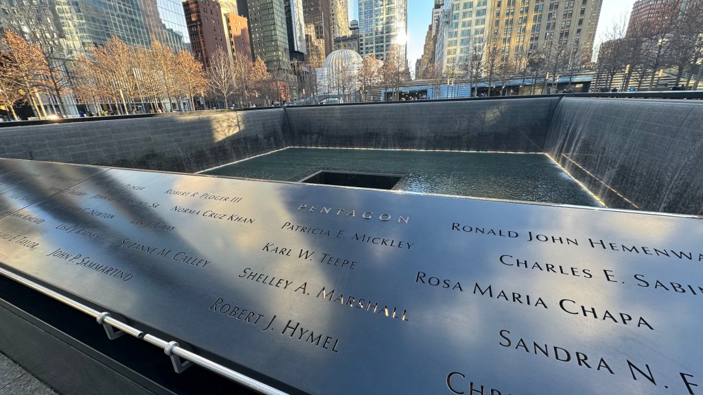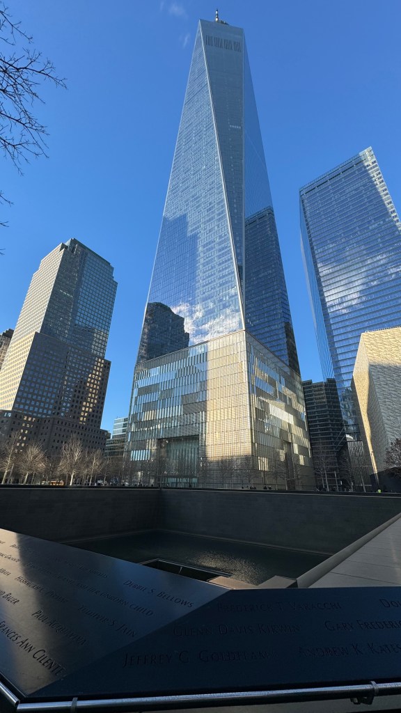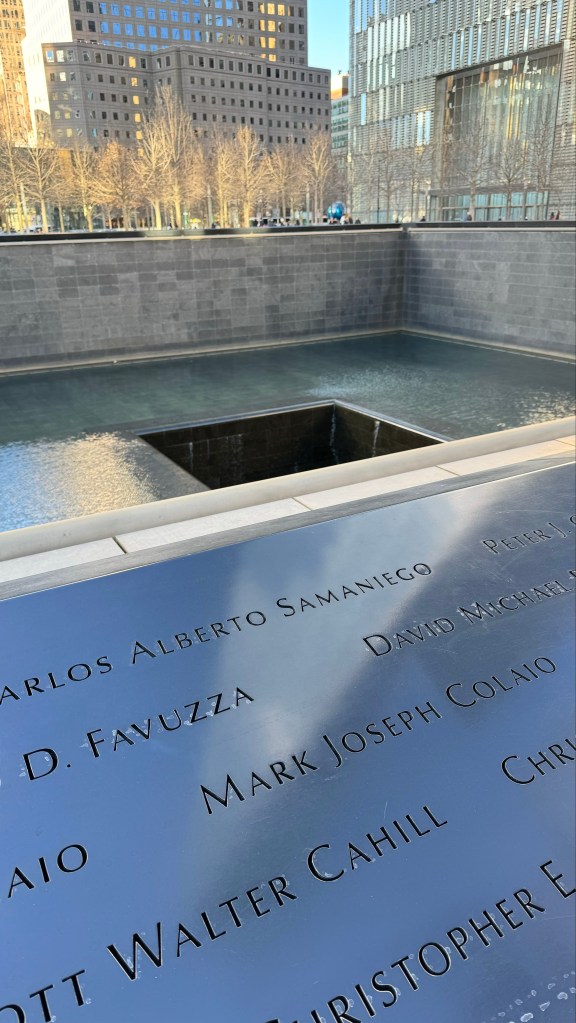 O espaço é livre para todos os visitantes, com duas “piscinas” de queda d’água infinita e um memorial com os nomes, gravados em placas de bronze, de todos as pessoas que perderam suas vidas em 11.09.2001.