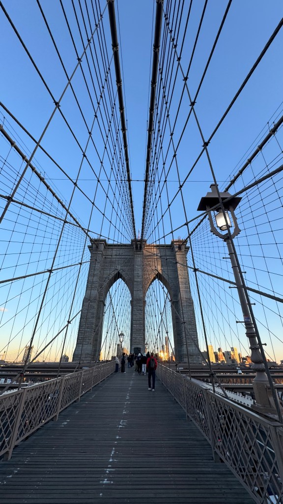 Atravessar a ponte a pé é muito legal, com vistas lindas e um ambiente muito agradavel, mas é mais legal no sentido do Brooklyn para Manhattan, assim você pode apreciar a vista para linha do horizonte, com os prédios e a Estatua da Liberdade. Outra coisa legal é ir no final da tarde para ver o sol se pondo em Manhattan. Prepare-se para tirar muitas fotos! Outra coisa bacana é reparar nas estruturas com vários cadeados que os turistas deixam por lá.