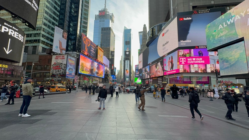 Está localizada no coração de Manhattan, entre a Broadway com a 7ª Avenida e entre as ruas West 42 e West 47, formando o cruzamento mais famoso de NY. A maior intersecção comercial de Nova York, é também conhecida como “Encruzilhada do Mundo.”