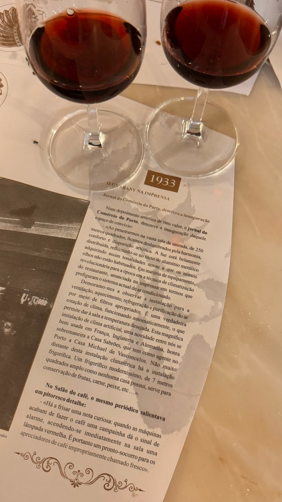 Entre os passeios pelo centro histórico do Porto, fizemos uma parada no icônico Café Guarany, um lugar que combina história, charme e boa gastronomia. Localizado na movimentada Avenida dos Aliados, o café é um dos estabelecimentos mais tradicionais da cidade, funcionando desde 1933.