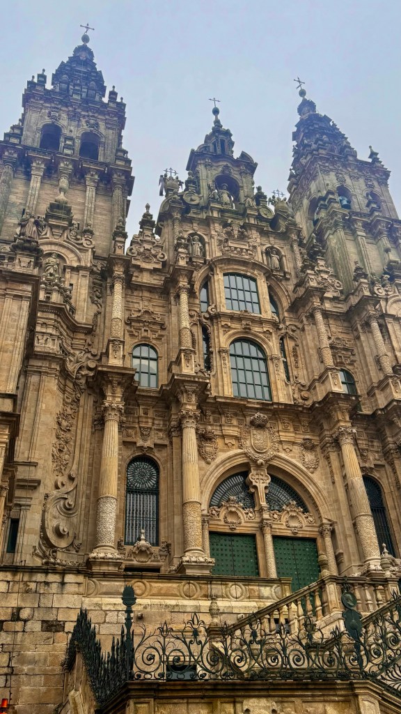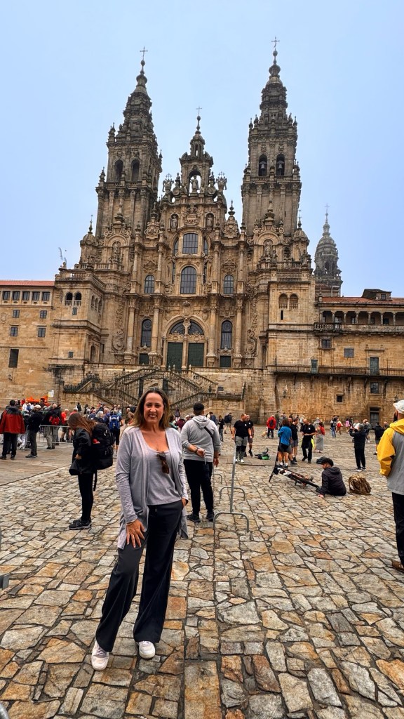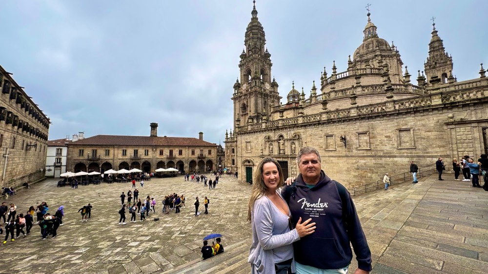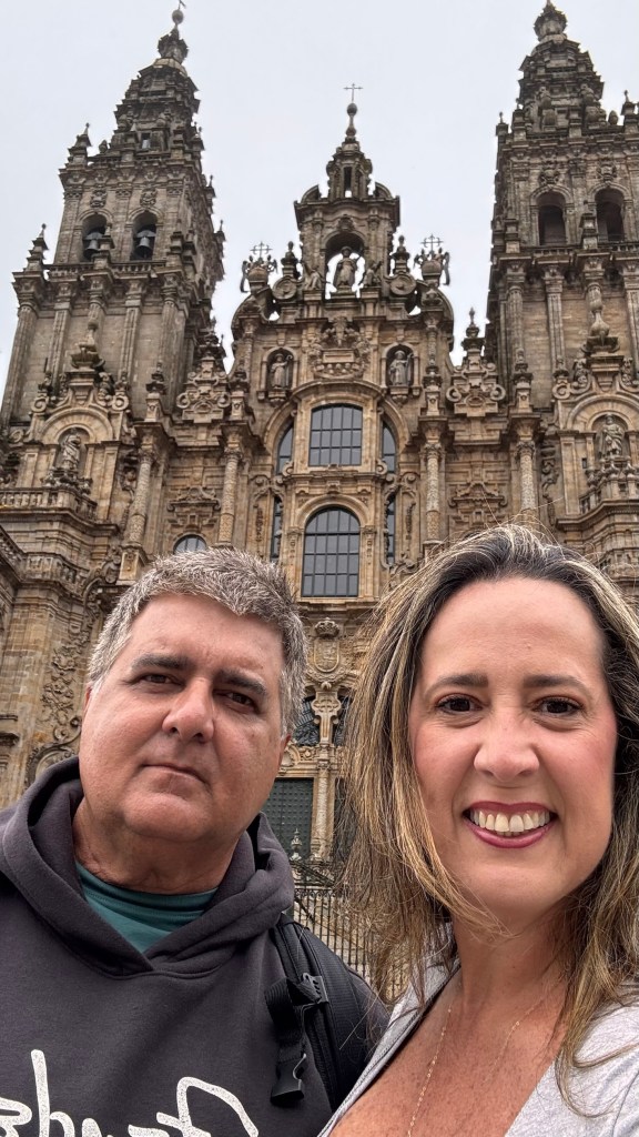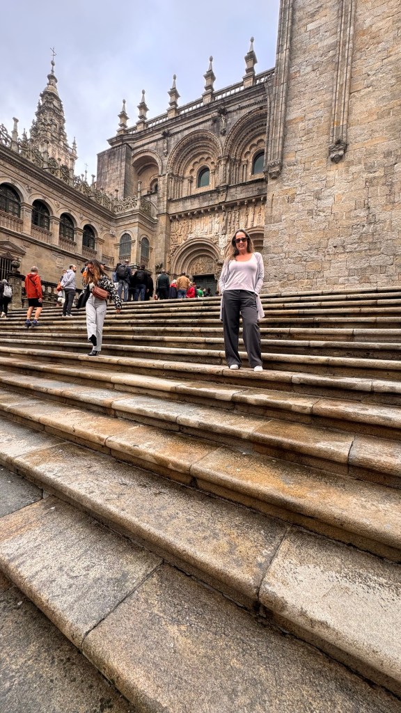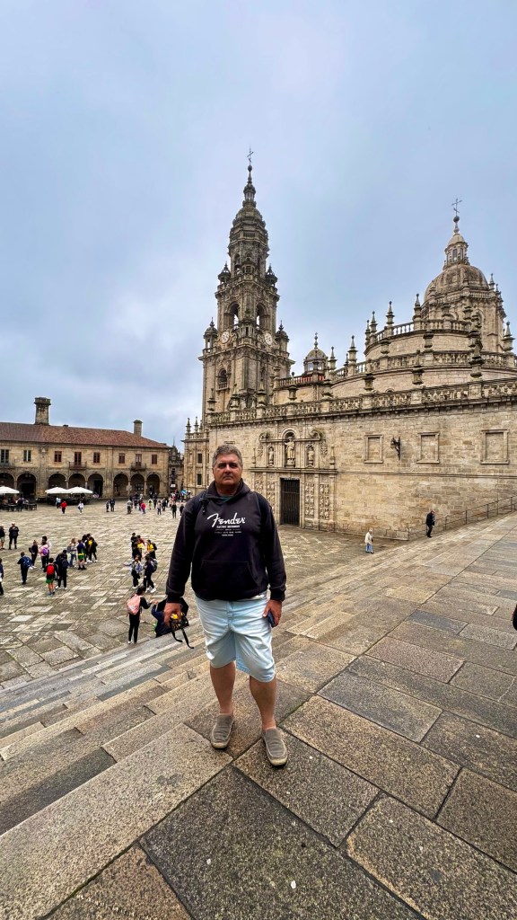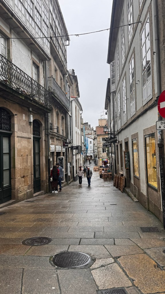 Assim que chegamos, percebemos a atmosfera vibrante da cidade. Caminhando em direção ao centro histórico, logo nos vimos cercados por ruas de pedra, edifícios históricos e uma mistura fascinante de turistas, estudantes e peregrinos carregando suas mochilas e cajados. A energia da cidade é única – uma mistura de emoção, cansaço e realização estampada nos rostos de quem percorreu centenas de quilômetros até ali.